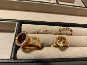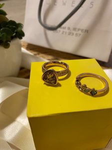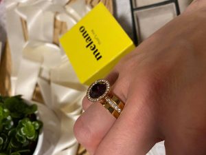 Ik heb al 2x maal een setje gekocht bij haar en lag telkens aan ongeveer een € 90 voor het setje ringen. Je koopt eerst een ring en dan een steentje naar keuze. Het aanbod is ook groot als het aankomt op de soorten stenen en ringen. Ik vind dit een leuke methode van mix en match. De eerste maal ging ik voor een gouden ring met daarop een driehoekig licht gelen/gouden steentje. En dan een koos ik nog voor een vrolijk meerkleurig ringetje. De tweede maal ging ik voor een dikkere ring met middenin enkele vrolijke witte steentjes. En een diep paarse ronde steen met rondom weeral enkele witte steentjes. Als andere ring koos ik een heel dun exemplaar met enkel witte steentjes. Ik vind het echt leuk dat je zelf je ring kan samenstellen. En de kwaliteit is top ! Voor een ring vind ik dit heel belangrijk. Je wilt namelijk niet na enkele uren al een groene verkleuring rond je vingers. Dus ga ik enkel voor ringen naar de juwelier of de betere boetiek. En mogen we niet vergeten erbij te zeggen dat  Evelyne van Mio Mio Jewels echt een lieve dame is  ! Ook vind ik de verpakkingen en doosjes waarin de juwelen gedaan worden bijzonder leuk. Zoals je op de foto zag kreeg ik de eerste maal een mooi geel / roze doosje.